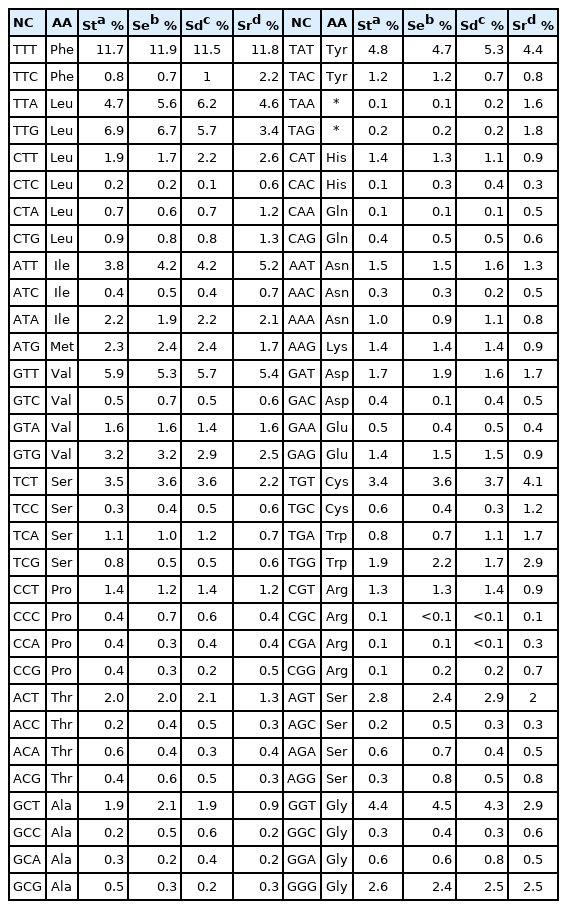 TCG Ser 0.8 0.5 0.5 0.6 TGG Trp 1.9 2.2 1.7 2.9