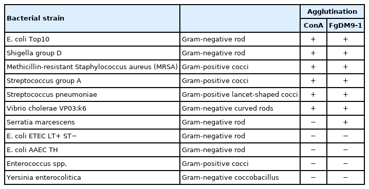 Serratia marcescens, was agglutinated by FgDM9-1 but not ConA. Five bacterial samples were neither agglutinated by FgDM9-1 nor ConA. The minimum concentration of FgDM9-1 that could fully agglutinate