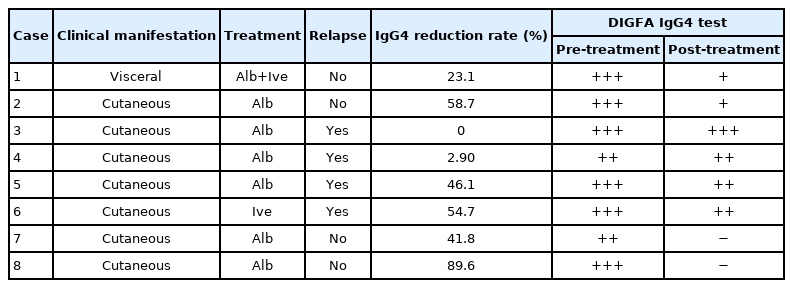 We have followed up 8 patients after treatment with single or multiple courses of albendazole and/or ivermectin. Post-treatment reduction in specific IgG4 levels for each patient was calculated by percentage, as follows: (1-post-treatment specific-IgG4 level/pre-treatment specific-IgG4 level)×100%. Clinical characteristics of the cases that have been followed up are summarised in
