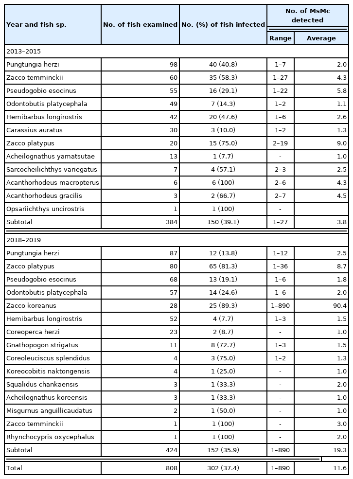 16]. However, the infection intensity with CsMc was over 110 in the latter period (2018 and 2019), and especially, those in 2 fish species, i.e.,