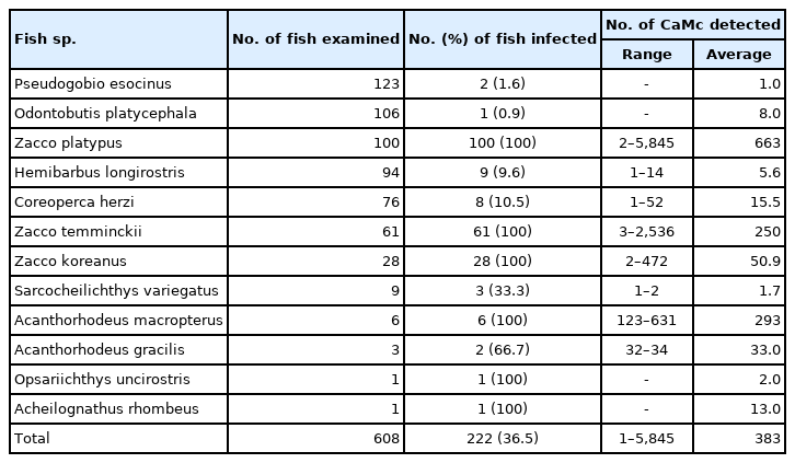 Table 5Overall infection status of Clinostomum complanatum metacercariae (CcMc) in fish from Soyang-cheon (stream) in Wanju-gun, Jeollabuk-do, Korea