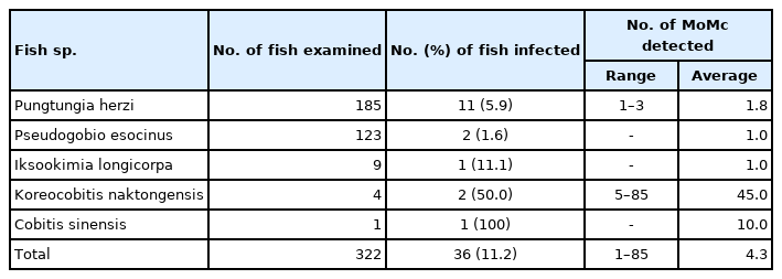 Table 6Overall infection status of Metorchis orientalis metacercariae (MoMc) in fish from Soyang-cheon (stream) in Wanju-gun, Jeollabuk-do, Korea