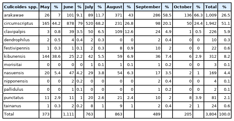 C. arakawae, the most frequently collected species, were collected during May–July (TI=0.07–0.69, respectively), followed by sharp increases in TIs during August–September (TI=2.4–4.08 respectively), followed by a sharp decrease in October (