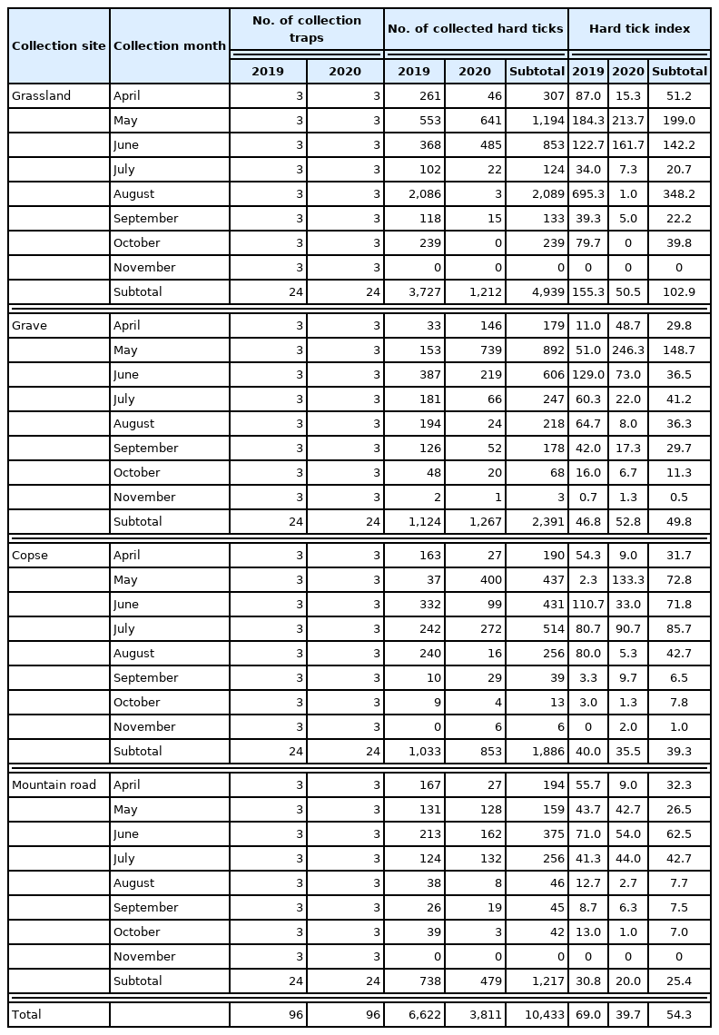 Ixodes nipponensis) were collected from four sites (grassland, grave site, copse, and mountain road) using collection traps from April to November during 2019–2020 in Ganghwa-do (