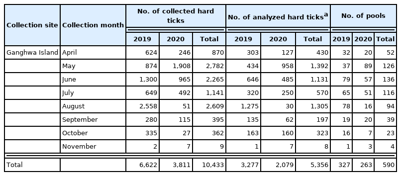 Surveys of hard tick surveys were conducted in a grassland, a grave site, a copse, and a mountain road with the collection trap method from April to November of 2019 using three collection traps per site (i.e., 12 traps in total) on Ganghwa-do. The geographic indices (longitute/latitude) for each of the four surveillance sites are 37.733344/126.395645, 37.734496/ 126.397436, 37.732803/126.398165, and 37.733885/126.396880. Hard ticks were collected at each site on the same day to determine SFTS virus infection. Any specific permissions were not required for tick collection at these sites, since this study did not involve endangered species. The collected specimens were transported alive to a laboratory in the Department of Parasitology and Tropical Medicine, School of Medicine, Inha University. The hard ticks were identified to species level with taxonomic keys and classified according to their developmental stage based on morphological features [