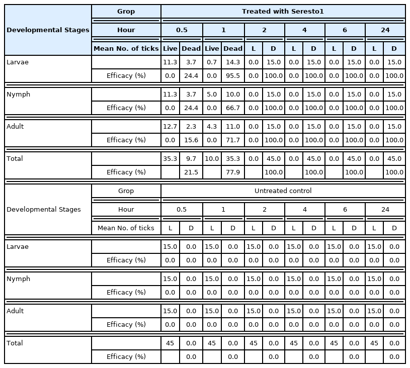 Table 1Efficacy of the hair from dogs treated with 10% imidacloprid and 4.5% flumethrin incorporated in a polymer matrix collar against the developmental stages of Haemphysalis longicornis