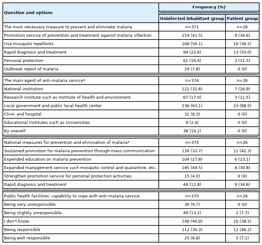 Table 3), the most common necessary measure mentioned was use of mosquito repellents (75.1%), followed publicity service of prevention and treatment against malaria infection (41.5%), and rapid diagnosis and treatment (24.4%). The same participants in this study reported previously that the 3 common preventive measures were not getting bitten by mosquitoes, wearing long-sleeved and bright-colored clothing, and being cautious when visiting malaria-prone regions. The responses about malaria prevention measures differed significantly between the UI and P groups. In this study, half of the P group respondents reported that the most necessary measure to prevent and eliminate malaria is rapid diagnosis and treatment. When asked about the most influential agencies providing anti-malaria service, both groups (UI group 63.1%, P group 88.5%) cited local governments and local public health facilities, followed by the national institution (UI group 32.6%, P group 26.9%) and research institute, such as Institute of health and environment (UI group17.9%, P group11.5%). Engagement and participation of local health authorities, such as the local Public Health Center (PHC) and the local government, play a critical role in successfully controlling and eliminating communicable diseases [