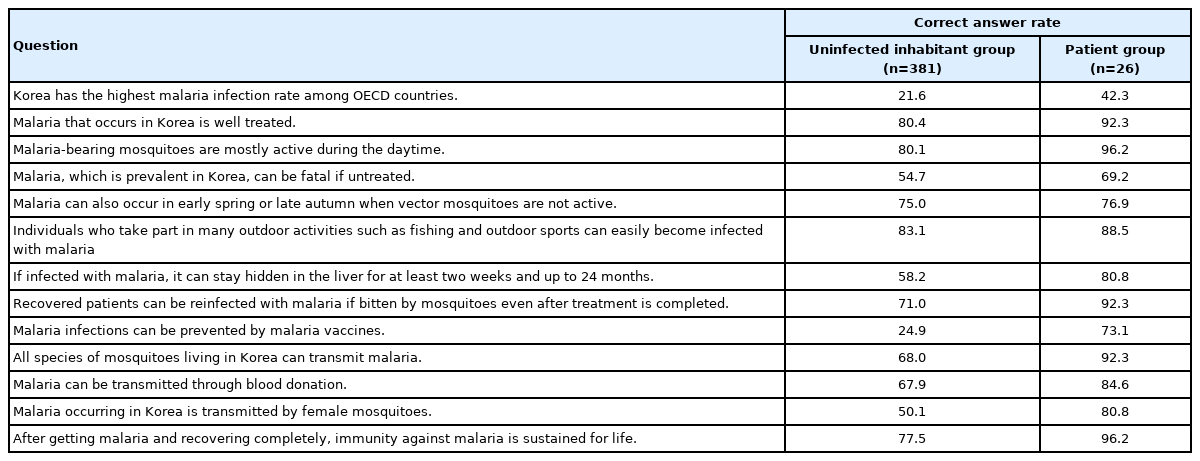 Questions about the features of vivax malaria in Korea consisted of 13 questions about the status of vivax malaria in Korea, the therapeutic situation, the pattern of vivax malaria outbreaks in Korea, the transmission vector, the life cycle of the vector mosquitoes, the incubation period, and immunity. The 13 questions about malaria were scored at 7.6923 each, giving a total score of 100 and were calculated for each respondent.