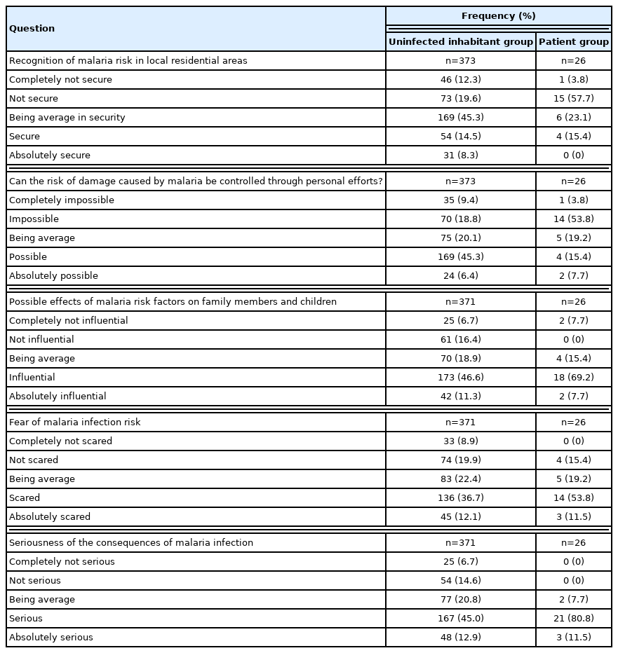 Risk awareness of vivax malaria infection was assessed using 5 questions related to the risk level of vivax malaria and the effectiveness of public awareness efforts. The questions used to assess the risk awareness for vivax malaria regarded 1) the recognition of malaria risk in local residential areas, 2) whether the damage caused by the risk of malaria can be controlled through personal efforts, 3) the possible effects of malaria risk factors on family members and children, 4) fear of malaria infection risk, and 5) the seriousness of the consequences of malaria infection.