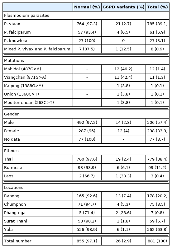 P. falciparum) of the patients. The G6PD variants were detected in 26 out of 881 patients (2.9%) and the rest 855 patients were normal G6PD individuals (97.1%). The prevalence of 26 G6PD-deficient persons varied by the locations represented in