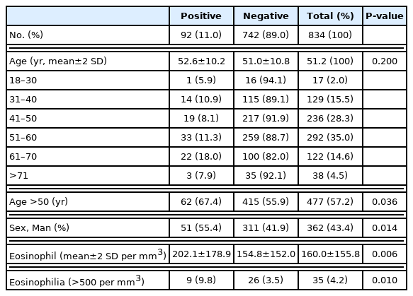 The present study was able to confirm the following: blood eosinophil count, age >50 years, and living in Sacheon (a city located in the Gyeongsangnam-do) were significantly associated with antibody positivity. Blood eosinophil count was significantly higher in the antibody-positive group, but only 9.8% of patients in the positive group had overt eosinophilia >500 per mm