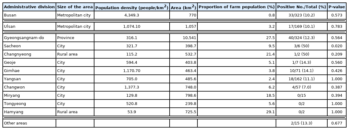 Fig. 1). In 1 city and 1 rural area, the positive rate was 50%, but the number of participants was small; therefore, caution is needed for interpretation. However, there was a statistically significant correlation between the positive test results and living in Sacheon (