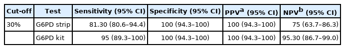 Table 1 Performance of the reference laboratory, G6PD strip and G6PD quantitative test kit (G6PD kit)