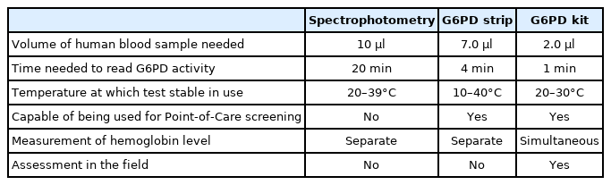 An outline comparing some characteristics between the methods used for G6PD screening in this study