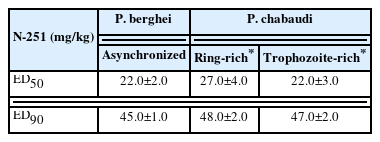 We expected higher effectiveness of N-251 could be collected using trophozoite-stage-rich P. chabaudi, but we received similar ED50 values with ring-stage- and trophozoite-stage-rich P. chabaudi and asynchronous P. berghei using the 4-day suppressive test. The 4-day suppressive test only reveals a drug’s overall impact after 4 days; it does not provide specific information on the various parasite stages. The parasite synchronization may be interrupted in the experiment since the life cycle of rodent malaria parasites is one day.