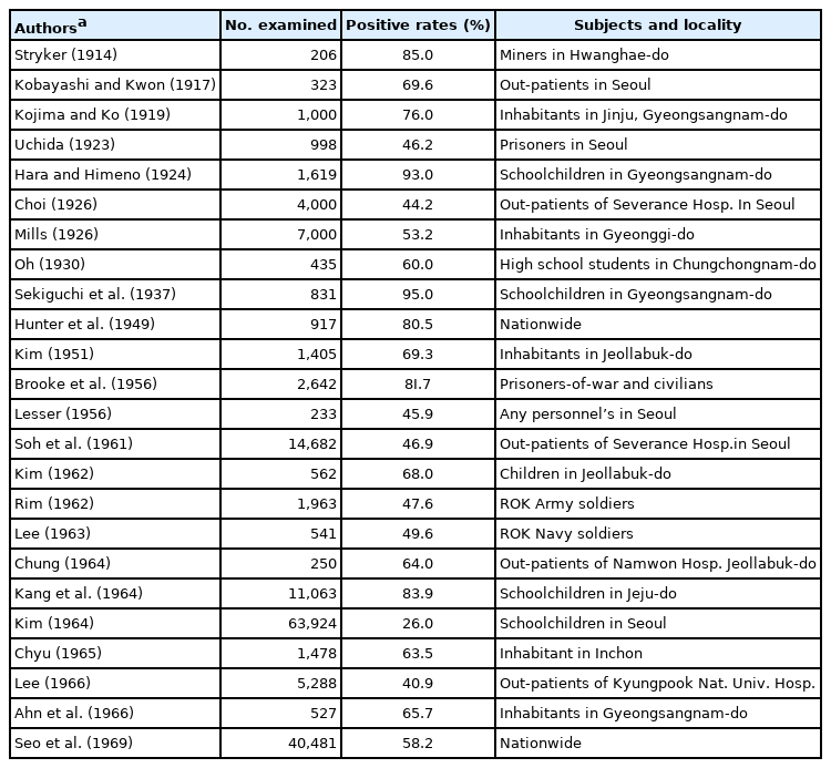 - 1. Mills RG. Parasites, chiefly metazoan, observed in 7,000 specimens of feces from Koreans with an attention to interpret the findings. Am J Hyg 1927;7(3):222-263.