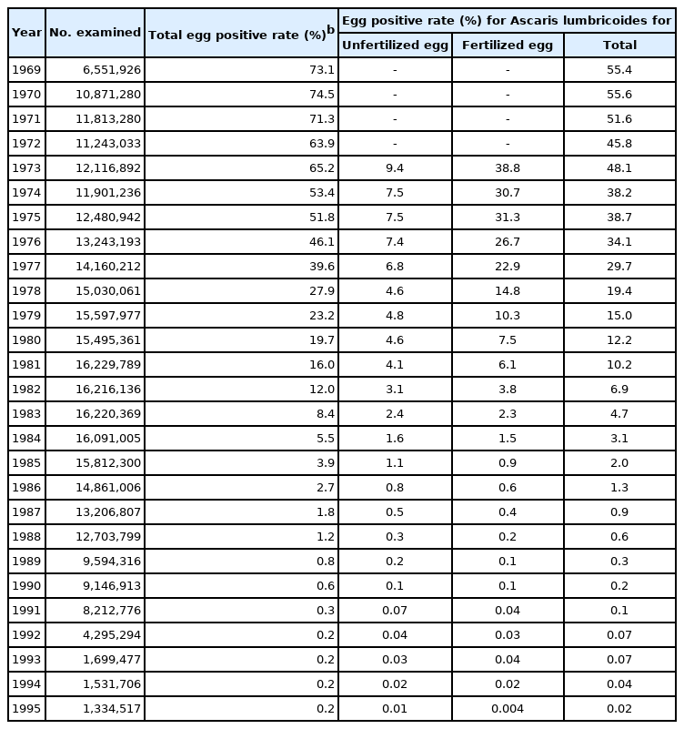 7]. There were, however, parasitologists who thought the prevalence rate should be based on actual and recent examinations. The press-released data may have exaggerated the real status of infections. Using the first research money granted by the Korean government to a parasitologist (1967–1968), they examined 40,581 stools collected nationwide by cellophane thick smear, 8,585 cellotape anal swabs and 1,174 stools by dilution egg counting [