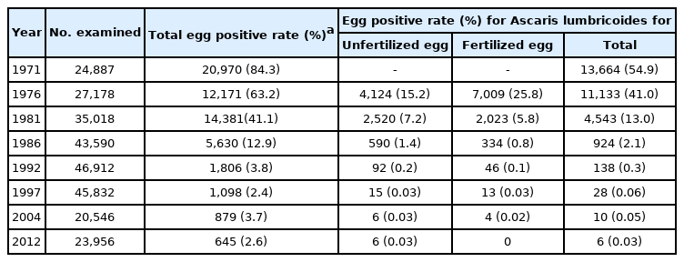 - 21. Kim CH, Soh CT. Seasonal fluctuation of survival period of Ascaris eggs in stool tank. Korean J Med 1964;7:607-609. (in Korean).