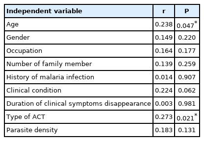 Table 2The correlation of age, gender, type of occupation, number of family member, history of malaria infection, clinical condition, duration of clinical symptoms disappearance, type of ACT and parasite density to parasite clearance