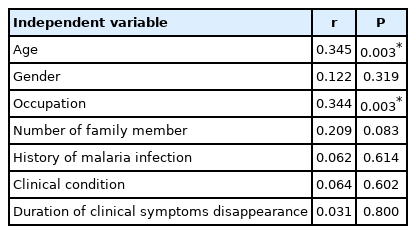 Table 3The correlation of age, gender, type of occupation, number of family member, history of malaria infection, clinical condition, duration of clinical symptoms disappearance to parasite density at the first came to the public health centre