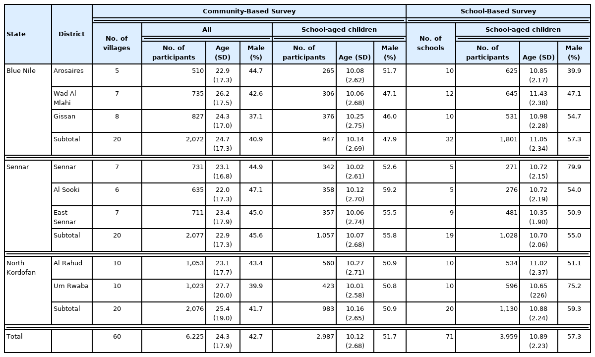 Ethical approval was obtained from the ethics review committee of the FMOH (FMOH/DGP/RD/TC/2016) and the ethical review board of the Korean Association for Health Promotion (130750–20,164-HR-020). For the community-based survey, written informed consent was obtained from household heads; for the school-based survey, written informed consent was obtained from head teachers and students. A separate informed consent form was developed for students, the script of this form was read to students by data collectors, and every detail was explained to the students. If a student decided to participate in the study, his, or her name was documented to record verbal consent. Owing to the large sample size, it was impractical to obtain written consent from the parents of school-aged children; instead, we obtained approval from the Institutional Review Board of the Federal Ministry of Health, Sudan. The survey protocol for informed consent complied with the standard procedure of the Federal Ministry of Health, Sudan.