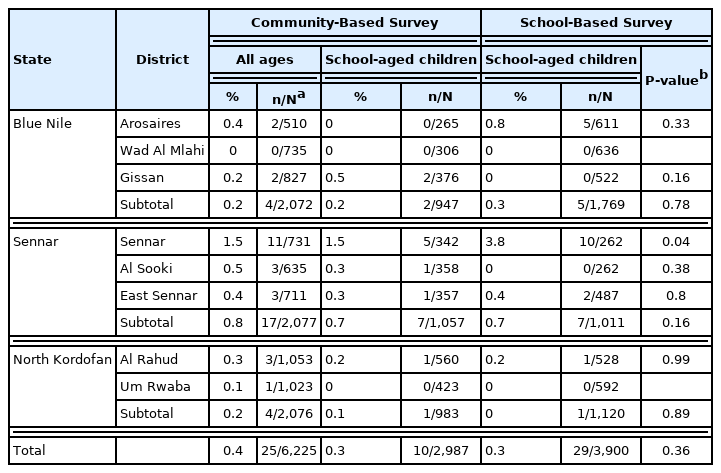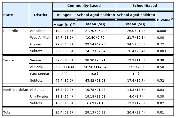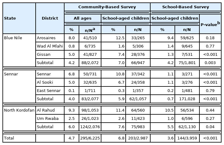 S. haematobium infections were substantial in localities, including Gissan in the Blue Nile state and Al Sooki and Sennar in the Sennar state. For example, according to the community-based survey, the prevalence of schistosomiasis among SAC in the Sennar district was 11%; however, this was only 1% according to the school-based survey. No significant difference between the 2 surveys was observed regarding the prevalence of
