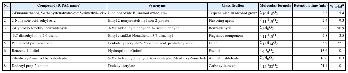 Fig. 2A, B). Among the signals with the highest intensities, the retention times were attributed to the following compounds: linalool (2.3 min), ethyl 2-nonynoate (2.4 min), 2-hydroxy-3-methylbenzaldehyde (2.6 min), 2,6-nonadienal, 3,7-dimethylnona-2,6-dienal (2.8 min), pentadecyl acrylate (5.2 min), hydroquinone (13.6 min), 2-hydroxy-5-methyl benzaldehyde (16.6 min), and dodecyl acrylate (21.4 min). All compound data were matched using NIST-MS software.