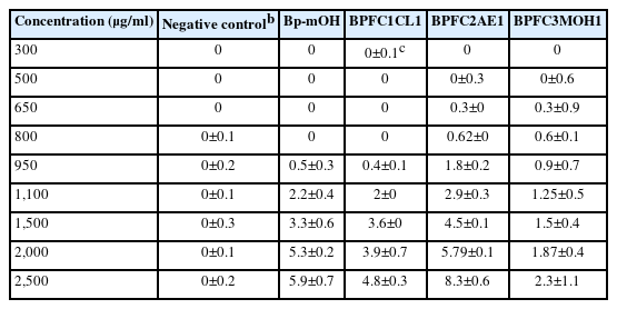 18]. The red blood cell suspension was incubated with various concentrations from 300 to 3,000 μg/ml of the extracts/fractions in pre-prepared aliquots in 2 ml microcentrifuge tubes for 30 min at 37°C while being protected from light. The absorbance values of the supernatants were measured at 405/540 nm using a microplate reader, ASYS UVM-340 [