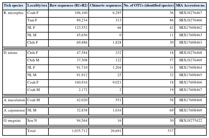 The metagenomic dataset of this study provides information on the microbiome diversity of the 5 collected tick species and a comparative analysis between sexes and among localities. A total of 1,035,712 raw read sequences (R1+R2) were processed from the 14 samples to obtain 537 unique OTUs, which were identified as observed species after trimming, removal of chimeric sequences, and size filtration. Female