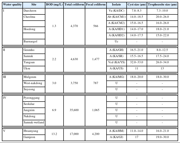 Table 1). Two types of FLA were detected in samples collected from Cheolma and Hoedong, and monoxenic cultures of amoeba were obtained for all Grade II water samples, except those collected from Baenaegol and Yusan. In total, 4 species of amoebae were isolated in the genus