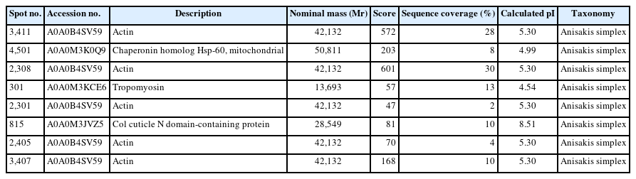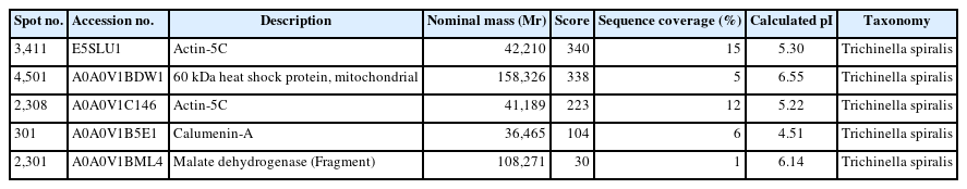 T. spiralis were identified as tropomyosin and calumenin A, respectively. Common spots 815 and 2,405 were not identified in