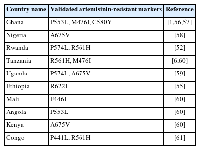 Country name Validated artemisinin-resistant markers Reference