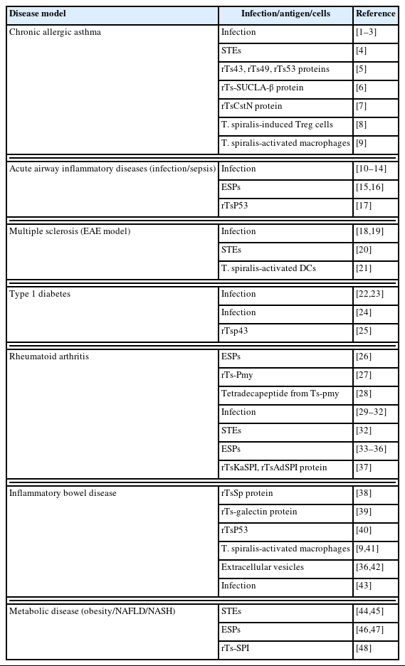 - 5. Sofronic-Milosavljevic L, Ilic N, Pinelli E, Gruden-Movsesijan A. Secretory products of Trichinella spiralis muscle larvae and immunomodulation: implication for autoimmune diseases, allergies, and malignancies. J Immunol Res 2015;2015:523875. https://doi.org/10.1155/2015/523875
