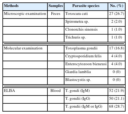 Table 1Positive rates of parasites in 101 fecal and 237 blood samples of stray cats by morphological, molecular genetical, and serological examinations