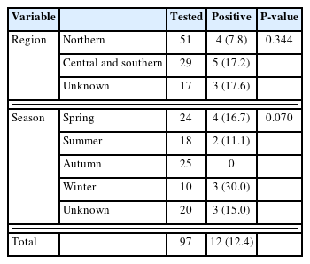 Table 1), resulting in a prevalence of 12.4%. This prevalence was lower than that reported in other animals in Korea, such as wild animals (45.2%), calves (16.9%), cattle (14.9%), and pigs (14.2%), but higher than that in bats (2.6%) and Korean cats (Jeju Island, 3.8%) [