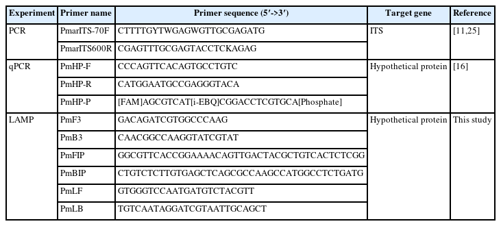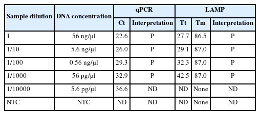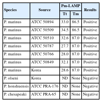 Table 4.Summary of 10-fold dilution series analysis of a Perkinsus marinus Korean strain using the Pm-LAMP assay and comparison with the results Pm-qPCR method